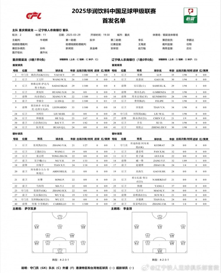 3月29日訊 今晚19:30,中甲第2輪迎來一場焦點戰(zhàn),重慶銅梁龍主場對陣遼寧鐵人,賽前雙方首發(fā)陣容公布。