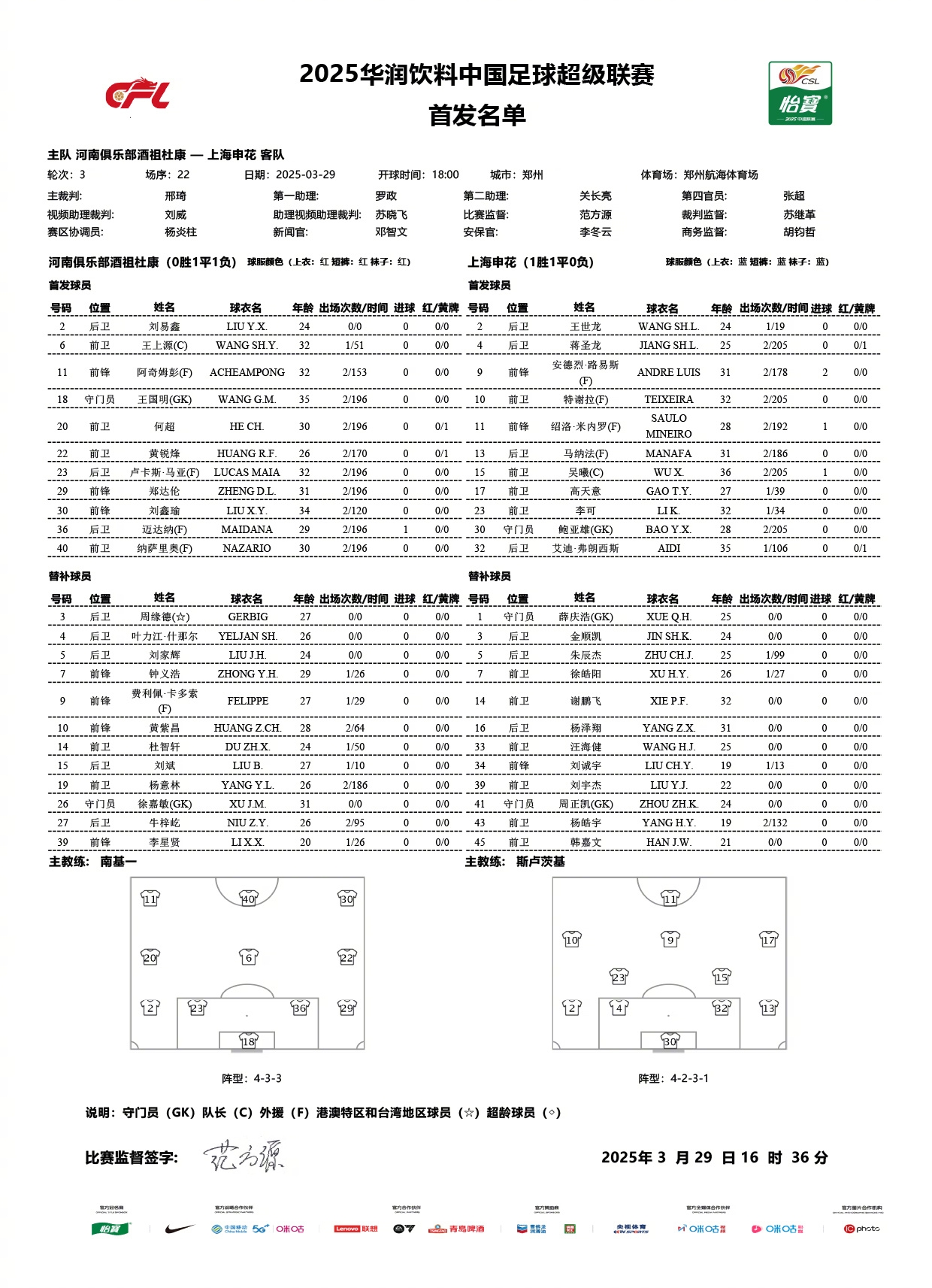 中超聯(lián)賽第3輪 河南俱樂部酒祖杜康vs上海申花 首發(fā)名單 ???