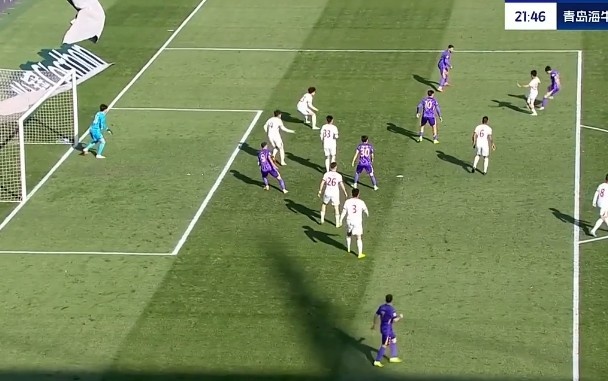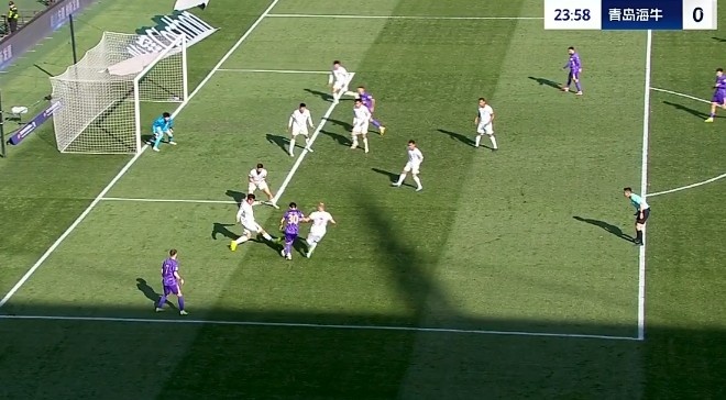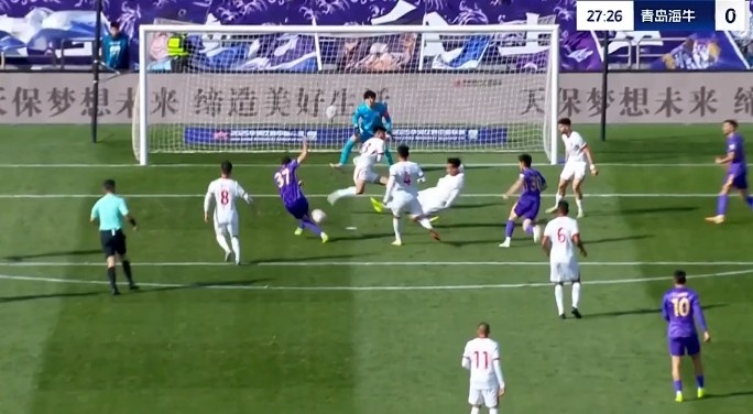 第31分鐘,青島海牛禁區(qū)里一次頭球攻門(mén)被門(mén)將飛身?yè)涑龅拙€(xiàn)?!?/p>