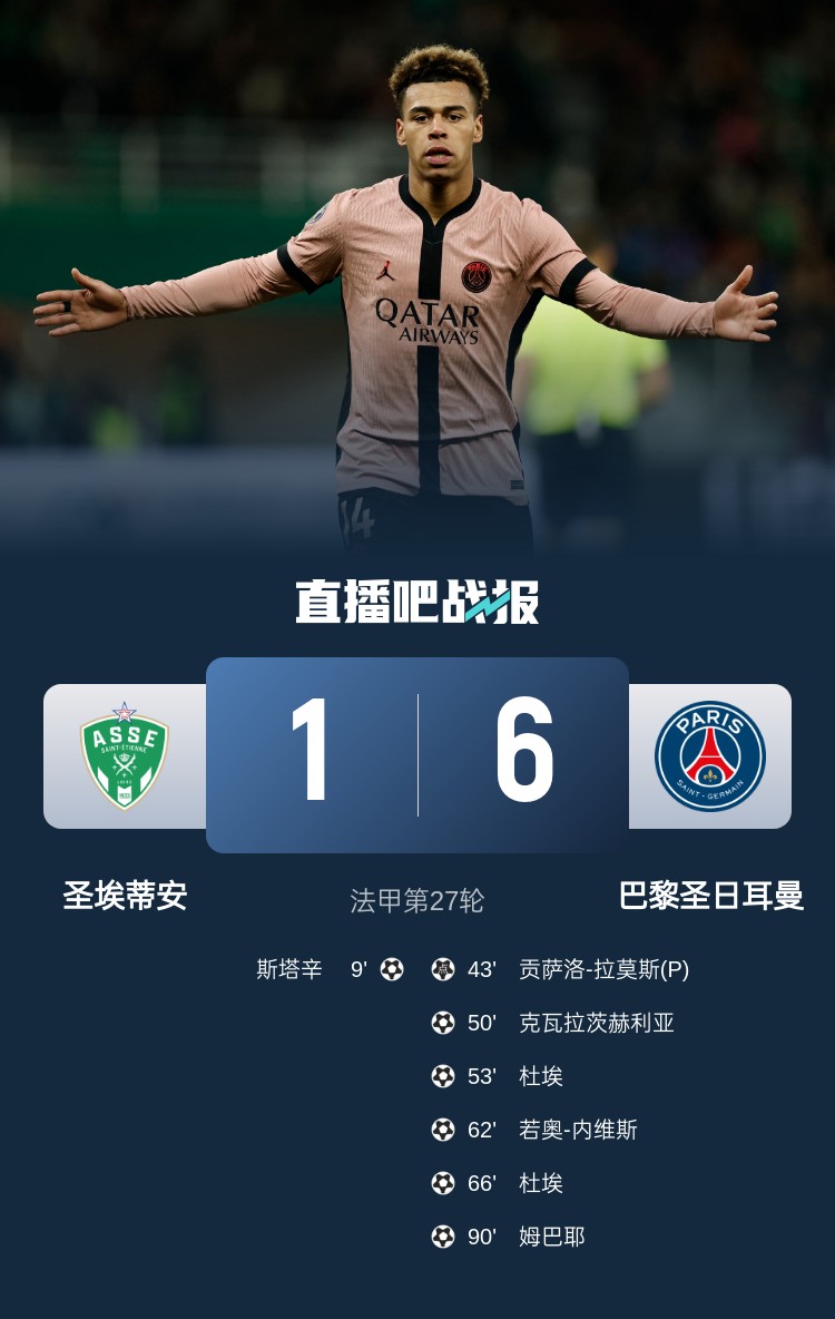 法甲第27輪,巴黎6-1大勝圣埃蒂安,暫以22分優(yōu)勢領(lǐng)跑。上半場,斯塔辛首開紀(jì)錄,貢薩洛-拉莫斯點(diǎn)射扳平;下半場,克瓦拉茨赫利亞擴(kuò)大比分,內(nèi)維斯破門,杜埃梅開二度,姆巴耶打進(jìn)一球。