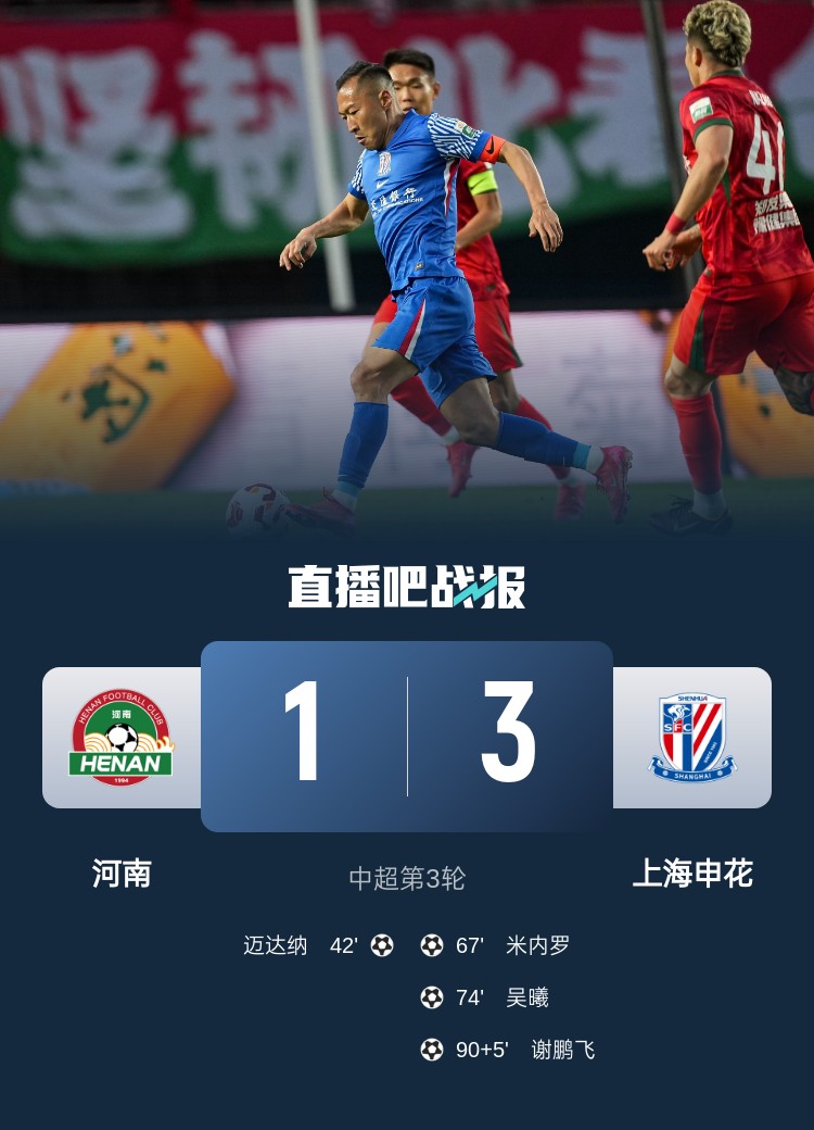 遭逆轉后,河南隊的韓國籍主帥南基一忍無可忍,直接將剛替換上場15分鐘的楊意林換下。申花燃起的求勝欲,徹底摧垮了對手。補時第5分鐘,反擊中米內羅左肋過人后回傳,替補出場的謝鵬飛推入空門,這場大逆轉的比分定格在3-1。