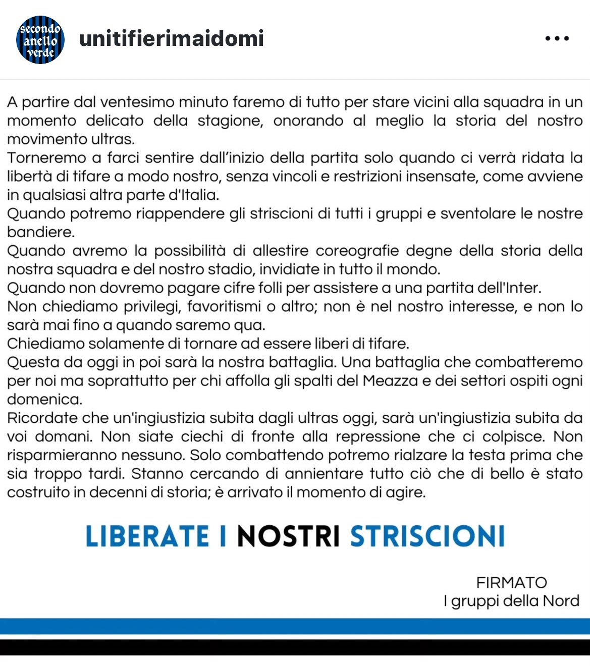 幾個(gè)月已經(jīng)過去了,但我們?nèi)匀粵]有被告知為什么這些標(biāo)語和旗幟不能被帶進(jìn)球場。過去幾十年中,這些標(biāo)語和旗幟象征著球迷們的自發(fā)聚集,能夠以信仰國米的名義團(tuán)結(jié)一代又一代的球迷們。