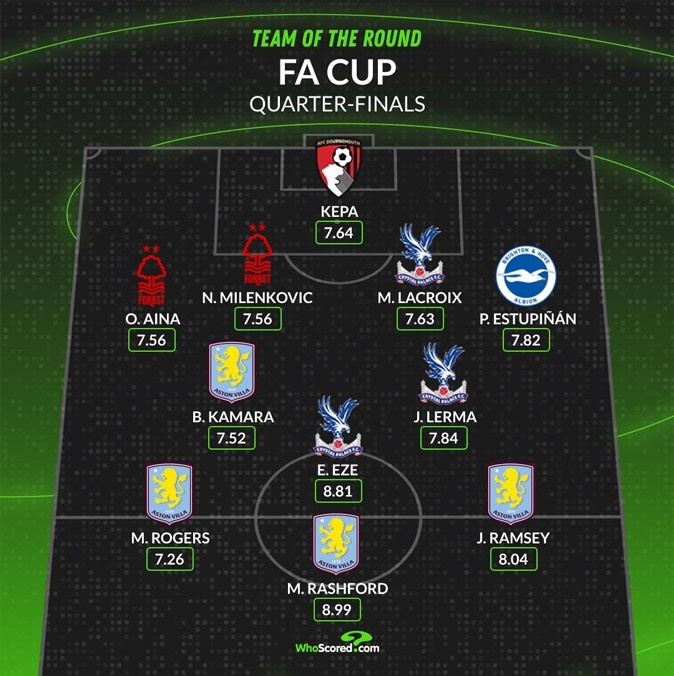 3月31日訊 足總杯八強(qiáng)戰(zhàn)已經(jīng)完賽,whoscored也列出了本輪評(píng)分最佳陣容,維拉4將在列。