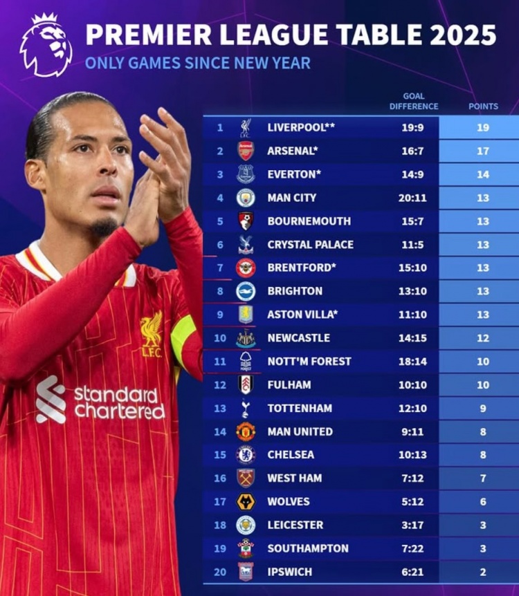 2月26日訊 《轉(zhuǎn)會市場》統(tǒng)計(jì)了2025年英超聯(lián)賽積分榜情況,利物浦壓阿森納居首。