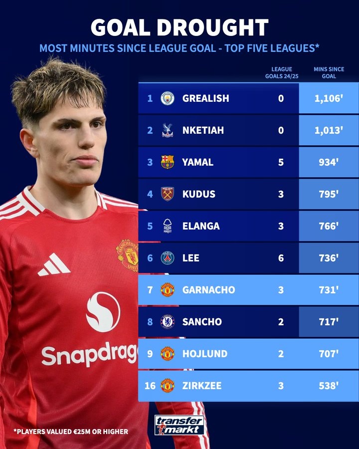 2月26日訊 德國轉(zhuǎn)會市場統(tǒng)計了目前五大聯(lián)賽的進球荒時間排名,曼聯(lián)有2名球員進入前十。