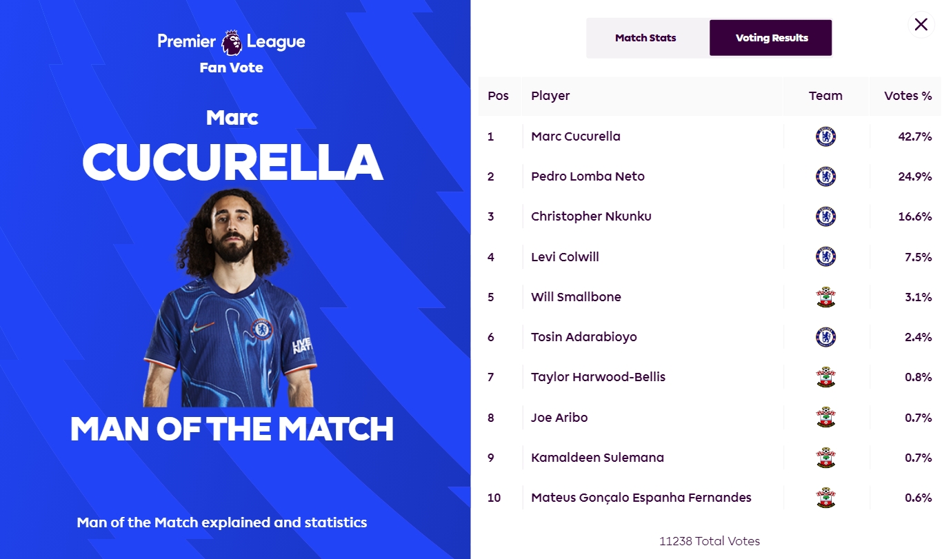 2月26日訊 本輪英超,切爾西主場4-0戰(zhàn)勝南安普頓。此役庫庫雷利亞發(fā)揮出色,以42.7%的得票率當選全場最佳球員。