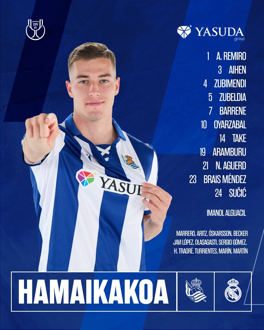 皇家社會替補:13-馬雷羅、6-埃盧斯通多、9-奧斯卡松、11-貝克、12-哈維-洛佩斯、16-奧拉薩加斯蒂、17-塞爾吉奧-戈麥斯、18-哈馬里-特拉奧雷、22-特倫特斯、28-巴勃羅-馬林、36-喬恩-馬丁