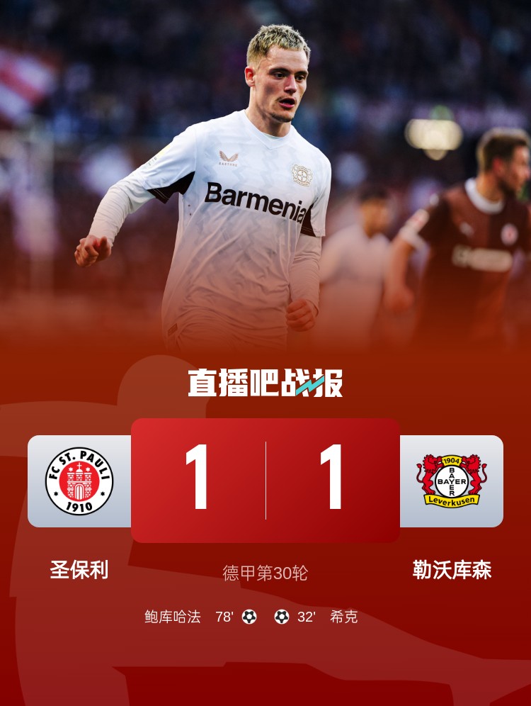 德甲-勒沃庫森1-1圣保利距榜首8分 ??祟^球破門格里馬爾多獻助攻
