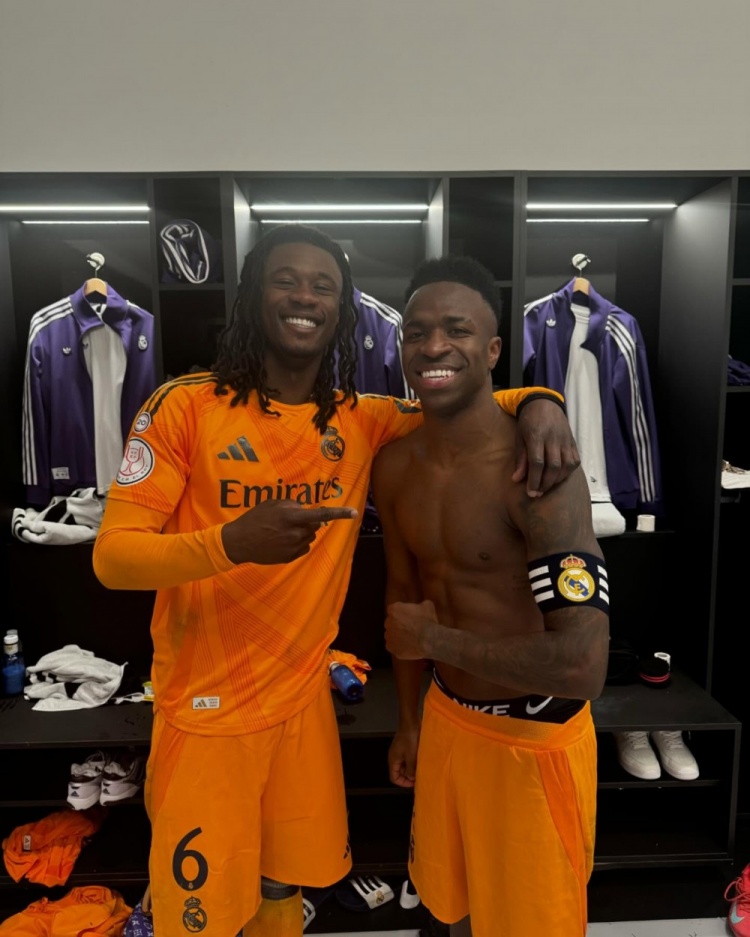 卡馬文加曬出自己與維尼修斯的合照并寫道:“和隊(duì)長(zhǎng)維尼修斯(后面還有莫德里奇、巴斯克斯、塞巴略斯和巴爾韋德)以及攝影師的照片????”