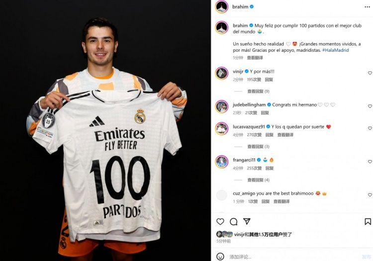 這也是迪亞斯為皇馬各項賽事出戰(zhàn)的第100場比賽,賽后他也在個人社媒曬出與100場紀(jì)念球衣的合影,配文寫道:“很高興能為世界最佳俱樂部完成100次出場,一個夢想實現(xiàn)了。美好的瞬間永存,讓我們?nèi)幦「?!感謝皇馬球迷的支持!”