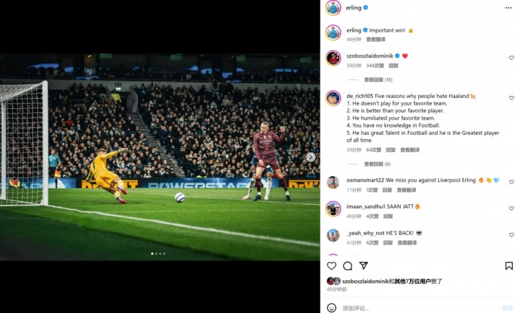本場比賽哈蘭德打進唯一進球,賽后他也在個人社媒曬出本場破門瞬間照片,配文寫道:“拿下一場重要的勝利!”