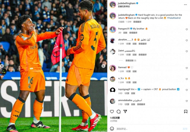 本場(chǎng)比賽貝林厄姆助攻恩德里克破門(mén),賽后貝林厄姆在個(gè)人社媒曬出與恩德里克互動(dòng)慶祝合照,配文寫(xiě)道:“一場(chǎng)艱難的勝利,為下回合創(chuàng)造了不錯(cuò)的局面。淘氣的舞步回歸?!?/p>