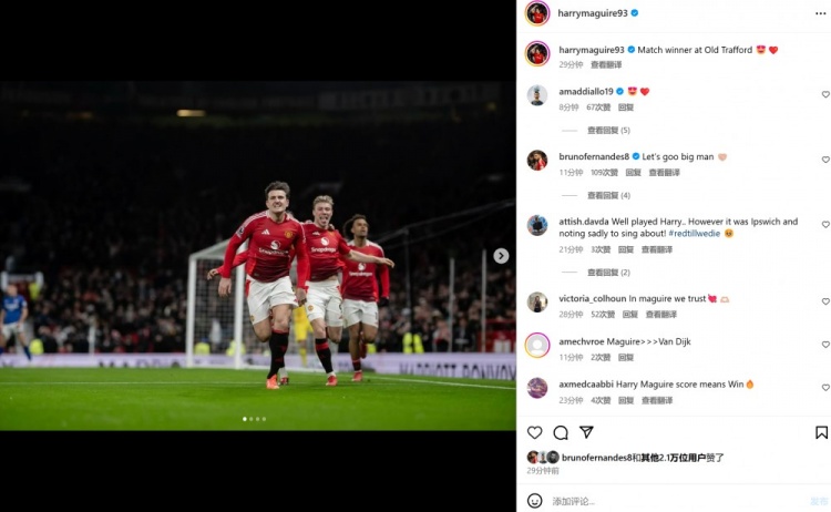 在下半場(chǎng)曼聯(lián)10人作戰(zhàn)的不利局面下,馬奎爾打進(jìn)關(guān)鍵進(jìn)球。賽后馬奎爾也在個(gè)人社媒曬出本場(chǎng)慶祝照,配文寫道:“在老特拉福德球場(chǎng)打進(jìn)制勝進(jìn)球!”