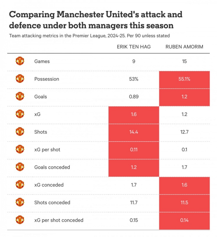 阿莫林加盟至今,曼聯(lián)在比賽中的關(guān)鍵指標(biāo)是否發(fā)生了變化?