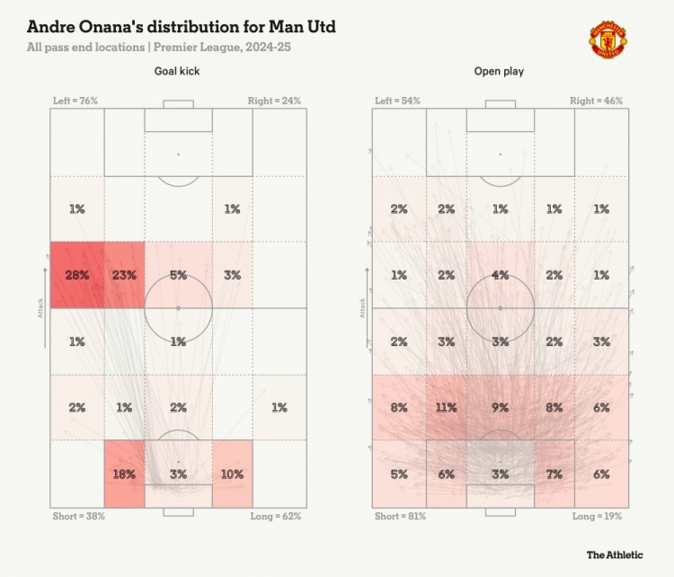 問(wèn)題似乎在進(jìn)攻組織的早期階段就已經(jīng)出現(xiàn),從奧納納開(kāi)始就是如此。曼聯(lián)似乎還沒(méi)有找到他最適合的出球方式——盡管現(xiàn)在有點(diǎn)兒趨勢(shì)了。本賽季,無(wú)論是在滕哈赫,還是在阿莫林麾下,奧納納經(jīng)常會(huì)采用長(zhǎng)傳球的方式出球,如下圖所示。