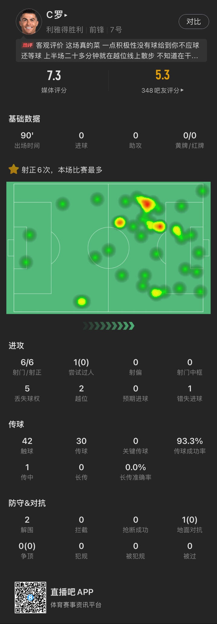 2月22日訊 沙特聯(lián)賽第21輪,利雅得勝利主場(chǎng)2-3不敵達(dá)曼協(xié)作,先賽距榜首8分。本場(chǎng)比賽C羅出戰(zhàn)首發(fā)打滿全場(chǎng),沒(méi)有取得進(jìn)球或助攻,媒體評(píng)分獲得了7.3分。