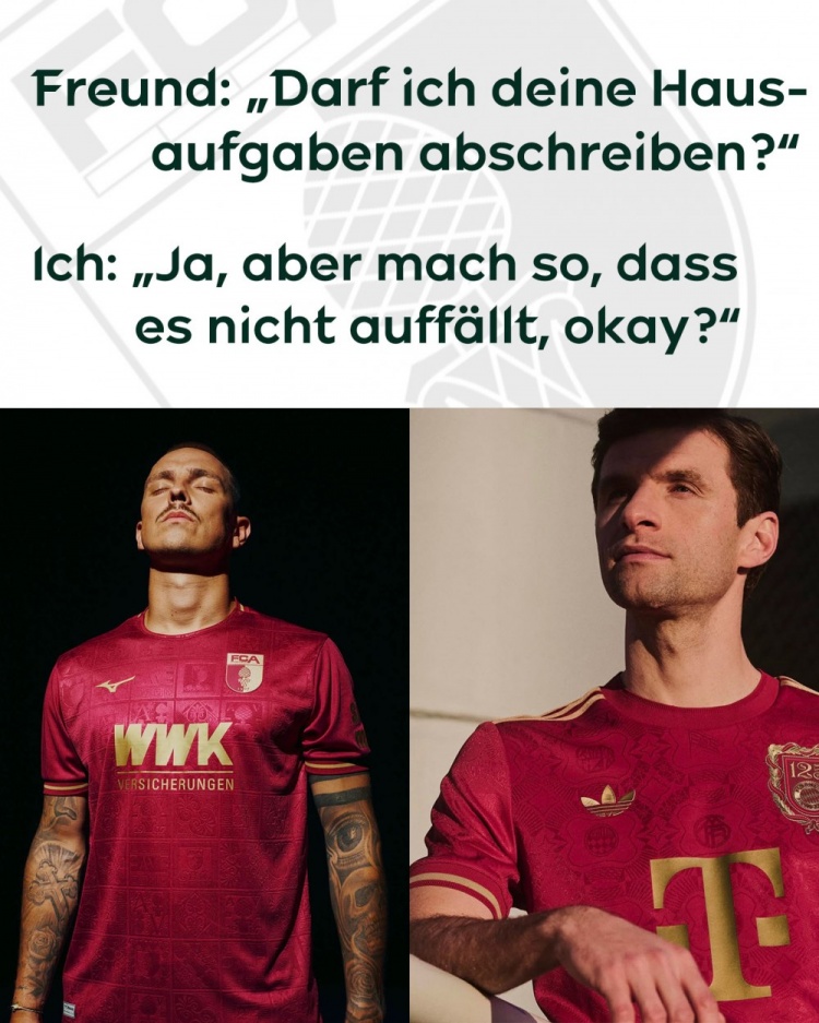 奧格斯堡還在對比圖上方有些幽默地配文道:“朋友:‘我可以抄你的家庭作業(yè)嗎?’我:‘可以,但要抄得不明顯一點,好嗎?’”