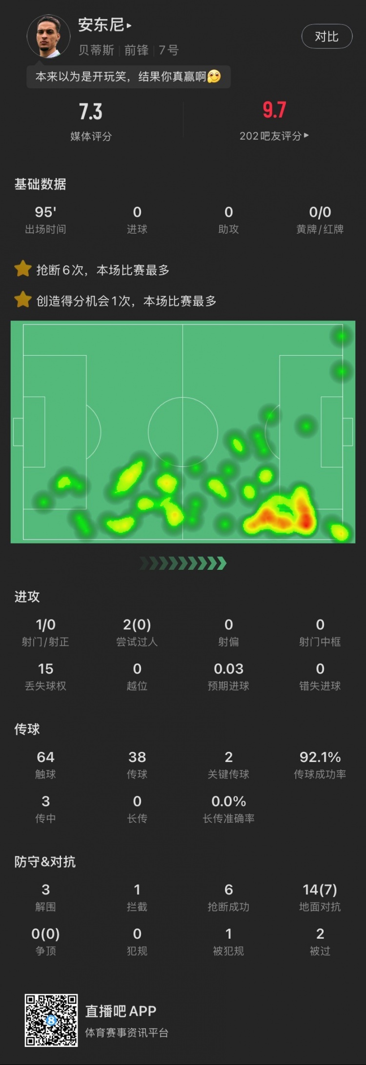 安東尼本場:搶斷6次全場最多,2腳關(guān)鍵傳球&3解圍,造阿拉巴黃牌
