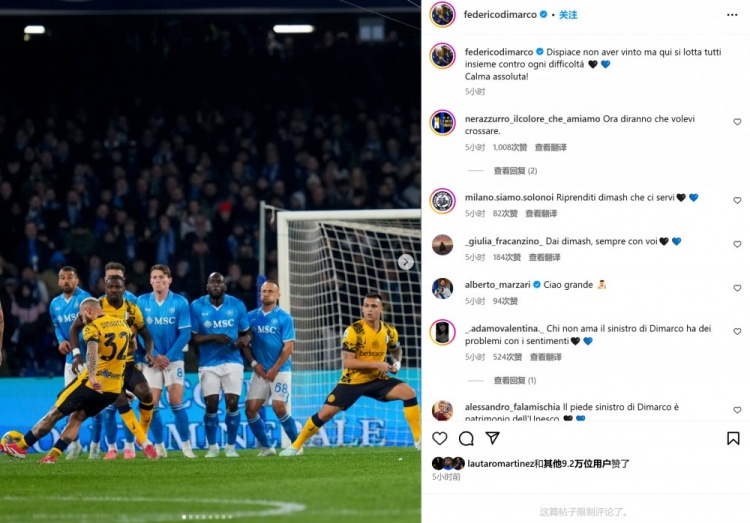 迪馬爾科曬任意球破門瞬間:很遺憾未能取勝,但我們?cè)趫F(tuán)結(jié)拼搏