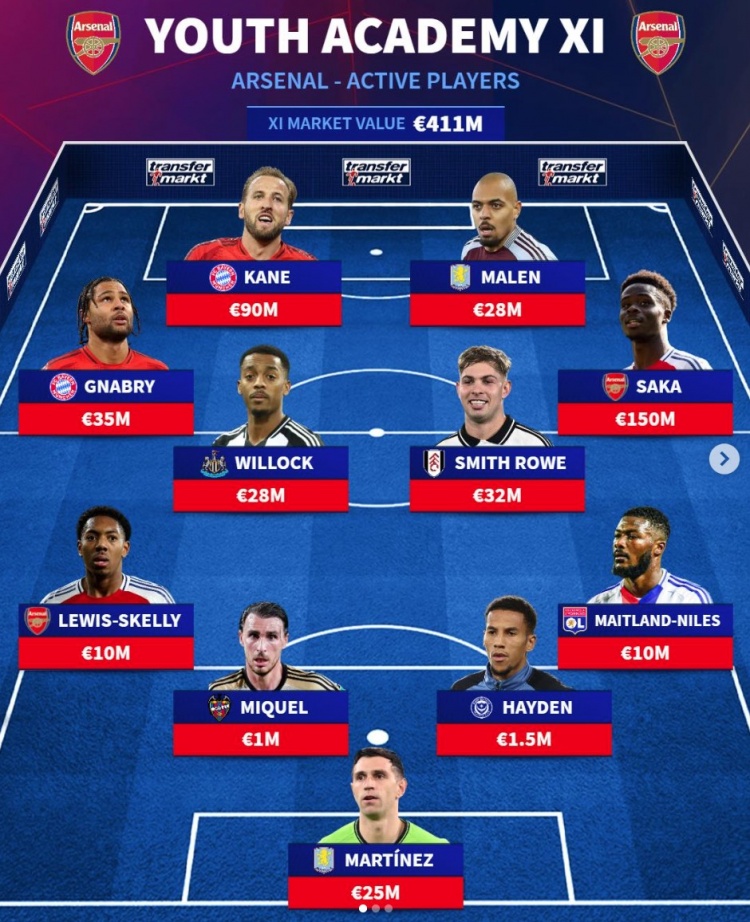 阿森納青訓當前最貴陣:總身價4.11億歐元