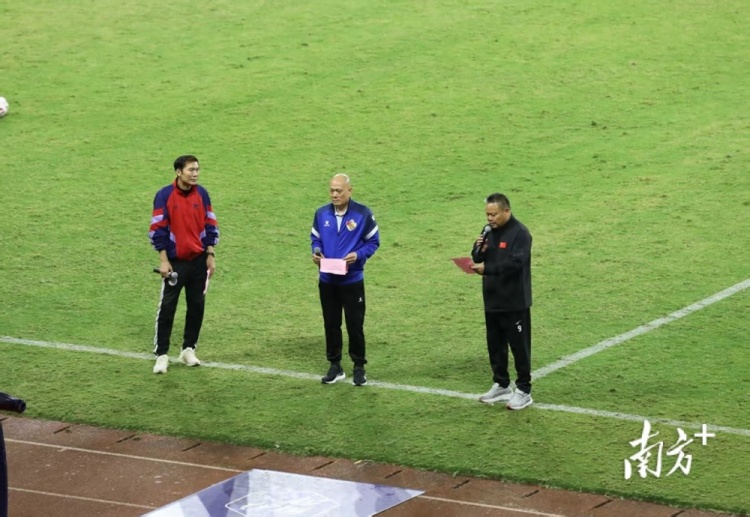 梅州客家主場(chǎng)對(duì)陣河南隊(duì)的比賽上半場(chǎng),梅州客家以2-0的比分領(lǐng)先。中場(chǎng)休息時(shí),來(lái)自梅州的三位足球名宿王惠良、池明華、謝育新出現(xiàn)在賽場(chǎng)上,用真摯樸實(shí)的話語(yǔ)為梅州客家加油。
