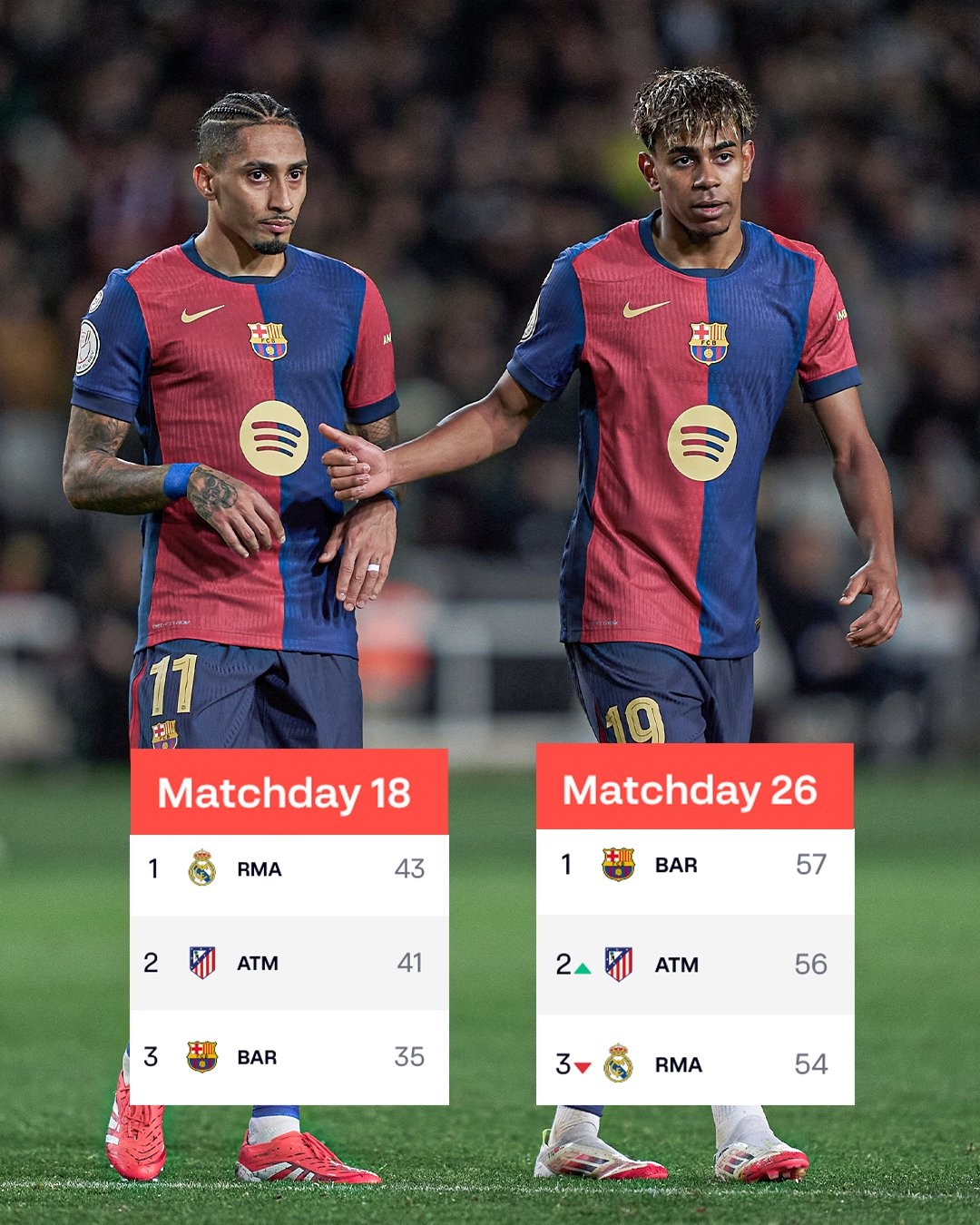 西甲第26輪后,巴薩57分第一,馬競56分第二,皇馬54分第三。