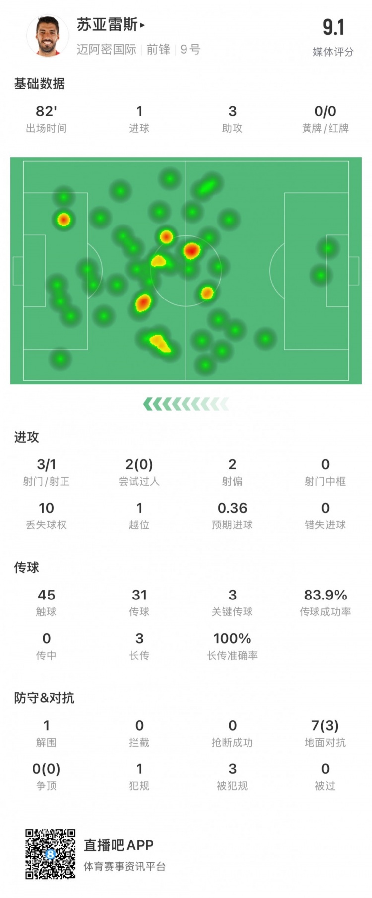 3月3日訊 美職聯(lián)常規(guī)賽,邁阿密國(guó)際對(duì)陣休斯頓迪納摩,蘇亞雷斯本場(chǎng)數(shù)據(jù):