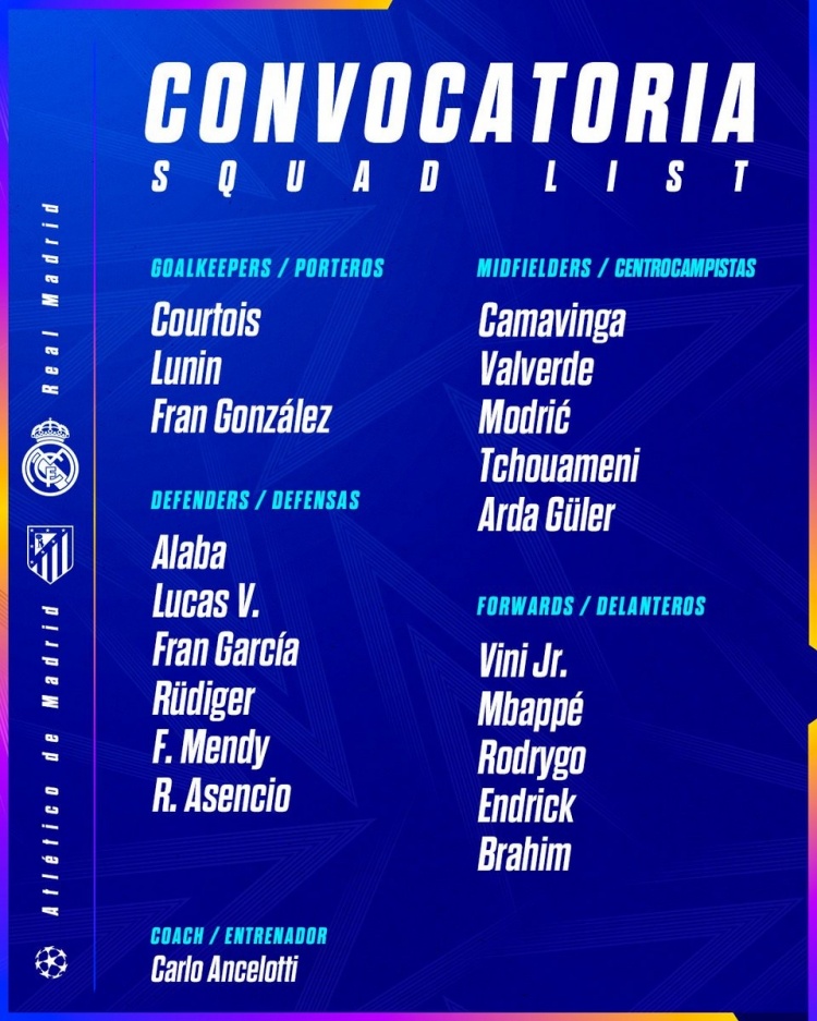 前鋒:維尼修斯、姆巴佩、羅德里戈、恩德里克、布拉欣-迪亞斯