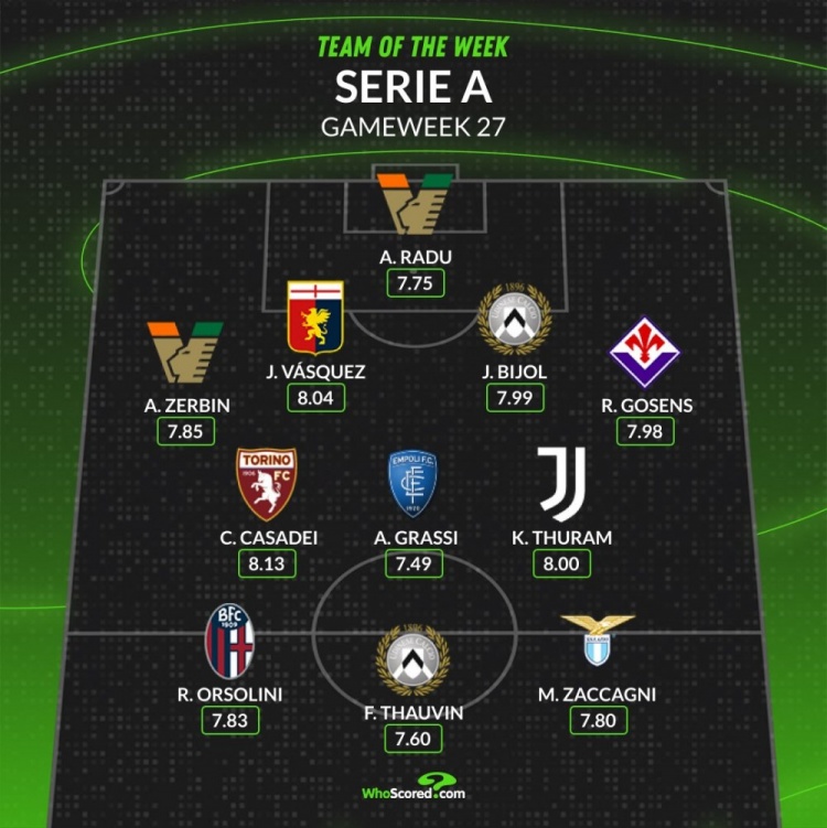 whoscored本周意甲最佳陣:
