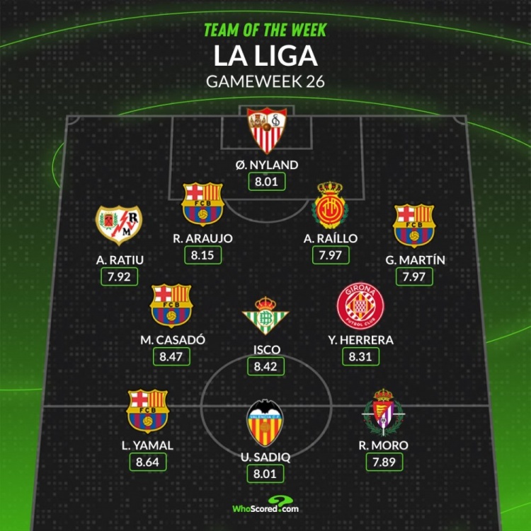 WhoScored評西甲第二十六周最佳陣:巴薩四名球員入選