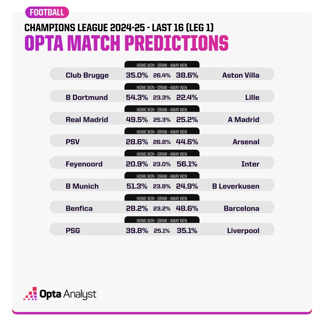 Opta預(yù)測歐冠16強(qiáng)賽首回合勝率: