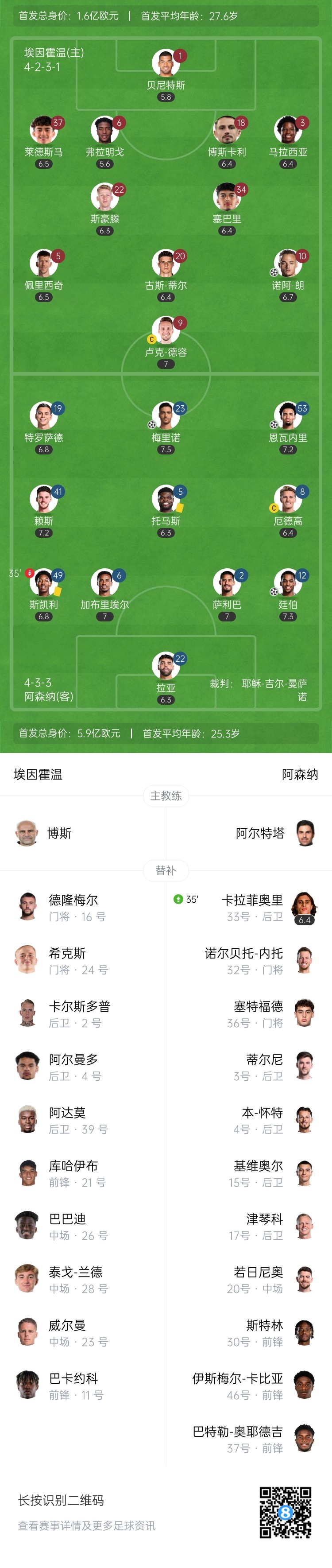 3月5日訊 北京時(shí)間4:00,歐冠1/8決賽首回合阿森納客場挑戰(zhàn)埃因霍溫,比賽在飛利浦大球場打響!上半場,廷伯頭球破門首開記錄,恩瓦內(nèi)里抽射建功;斯凱利染黃;隨后梅里諾再下一城!托馬斯送點(diǎn),諾阿-朗點(diǎn)射扳回一球。半場結(jié)束,阿森納暫時(shí)3-1領(lǐng)先埃因霍溫。