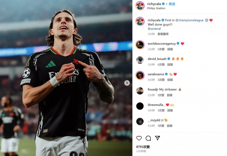 卡拉菲奧里也在賽后通過社媒曬出自己手指隊徽的慶祝照,并紀(jì)念道:“我的歐冠首球!伙計們干得漂亮!@阿森納”