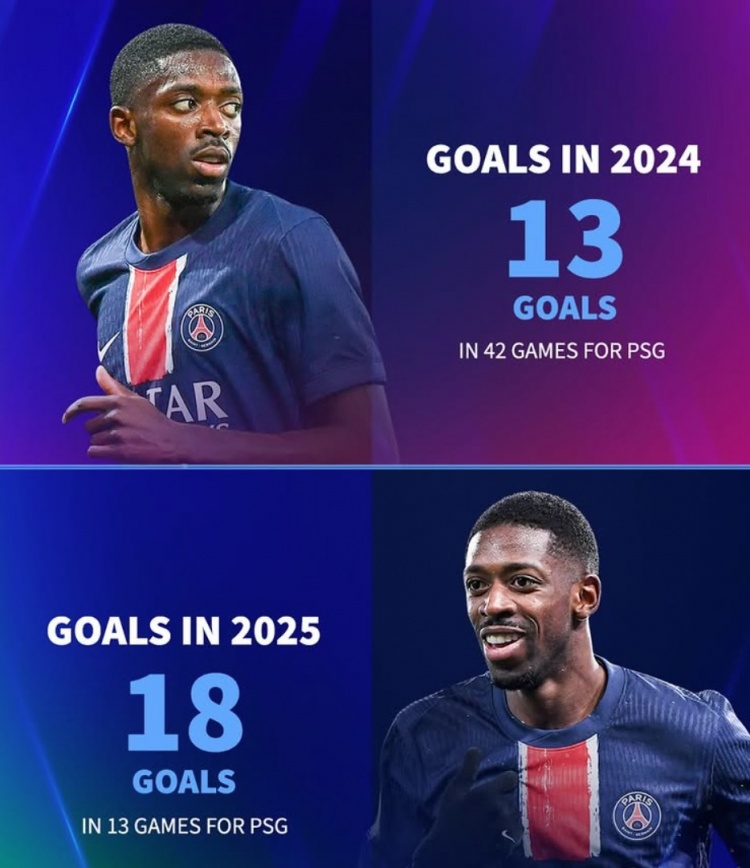 數(shù)據(jù)統(tǒng)計(jì)顯示,登貝萊去年為巴黎各項(xiàng)賽事42場(chǎng)僅打進(jìn)13球,而今年13場(chǎng)已打進(jìn)18球。