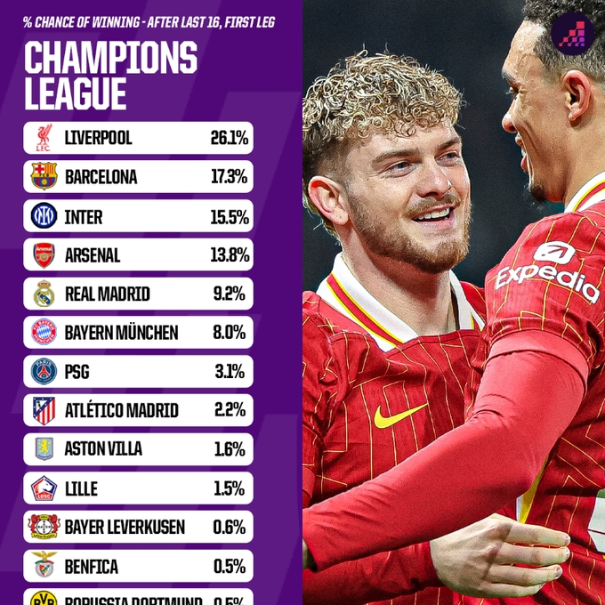 Opta歐冠晉級概率:利物浦、巴薩有望會師決賽 國米、槍手劍指4強(qiáng)