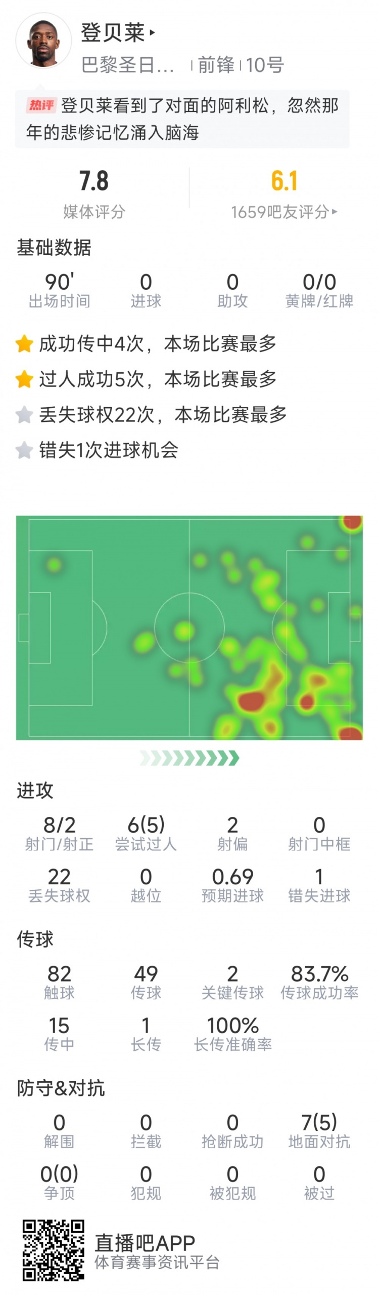 登貝萊本場數(shù)據(jù):8射2正,1次錯失良機(jī),2次關(guān)鍵傳球,5次過人