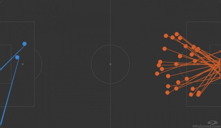 在whoscored統(tǒng)計的射門圖上,利物浦唯一的射正就進(jìn)球了,另一腳頂向了角旗;巴黎的射門則是密密麻麻……