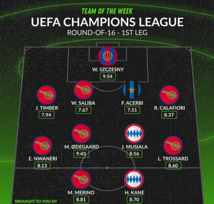 Whoscored評本輪歐冠最佳陣:厄德高領(lǐng)銜阿森納7人入選,凱恩在列