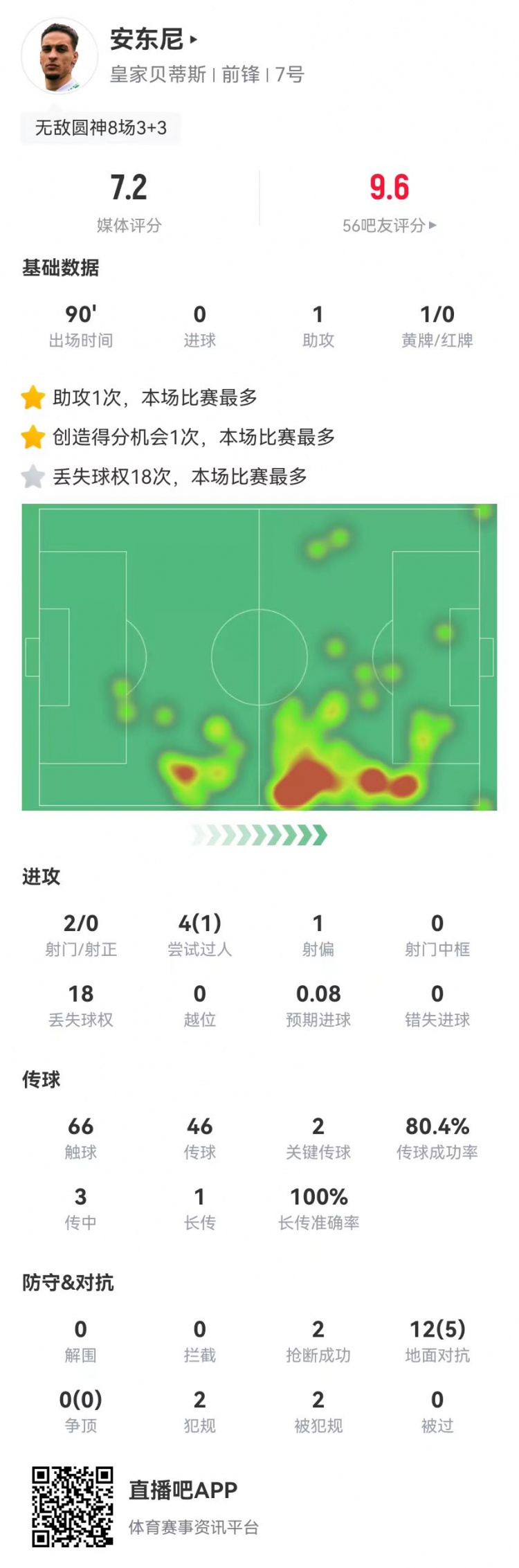 3月7日訊 貝蒂斯在本輪歐協(xié)聯(lián)2-2戰(zhàn)平吉馬良斯,曼聯(lián)租將安東尼本場(chǎng)數(shù)據(jù)如下: