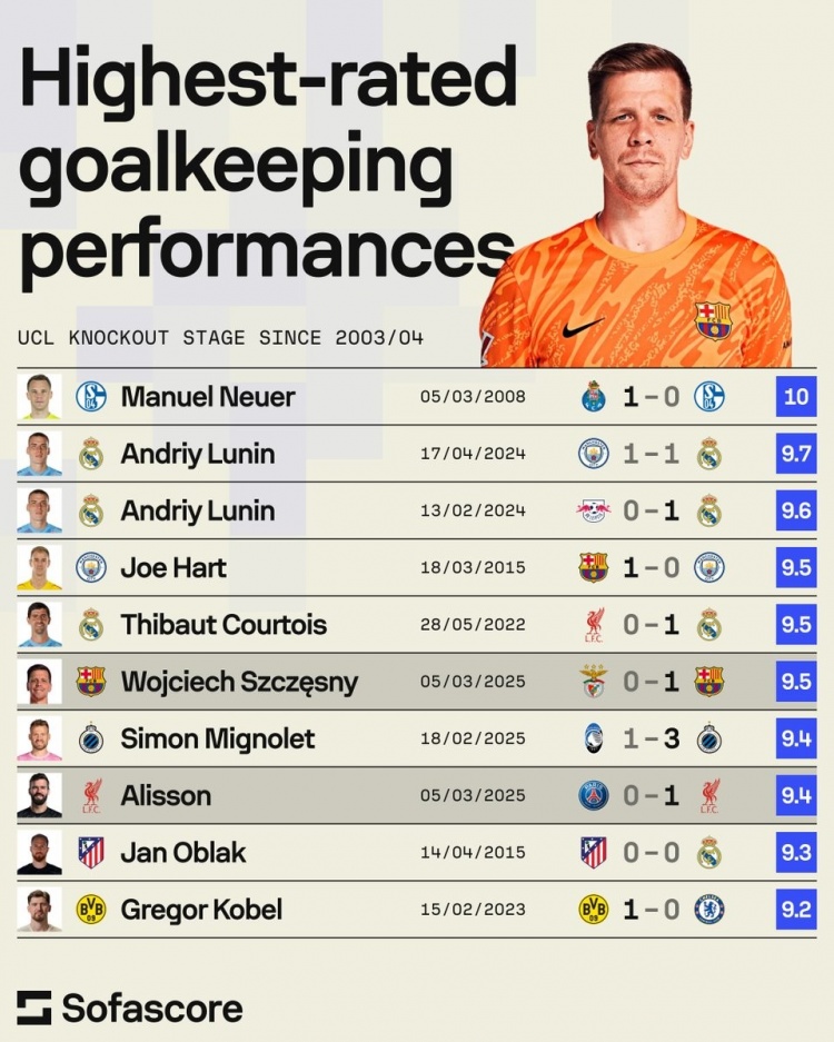 sofascore歐冠淘汰賽歷史門將評(píng)分榜:03-04賽季以來有統(tǒng)計(jì)