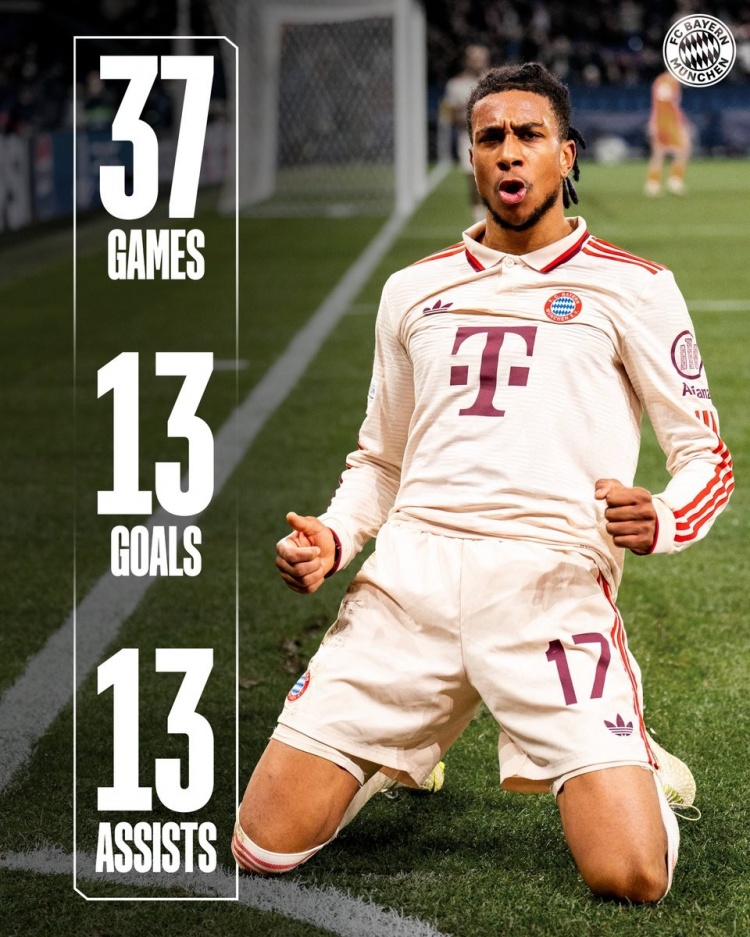 數(shù)據(jù)統(tǒng)計顯示,23歲的法國邊鋒在去年夏天5300萬歐元從水晶宮轉(zhuǎn)會拜仁,本賽季各項賽事為拜仁出戰(zhàn)37場,貢獻(xiàn)13球13助攻。