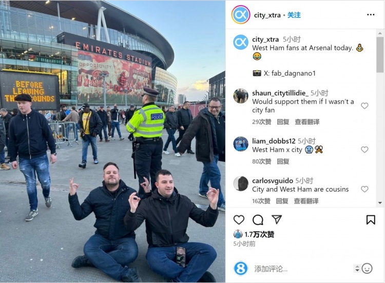 西漢姆球迷打坐慶祝戰(zhàn)勝阿森納,哈蘭德社媒點贊