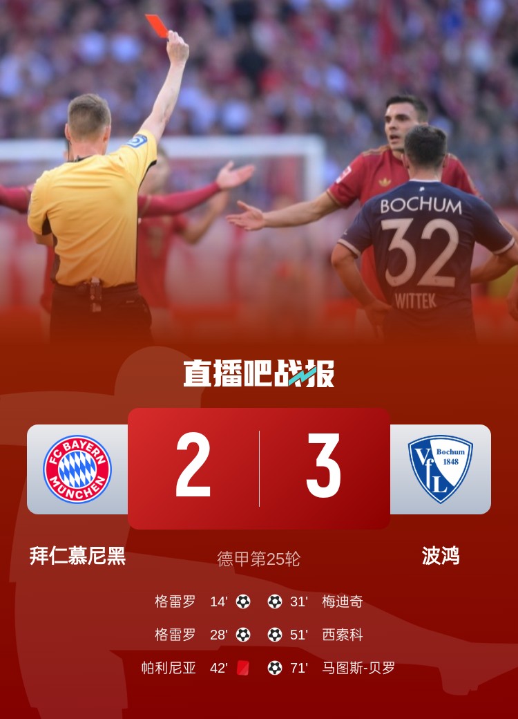 在德甲落后拜仁2球但最終逆轉(zhuǎn)獲勝!波鴻是歷史第4隊