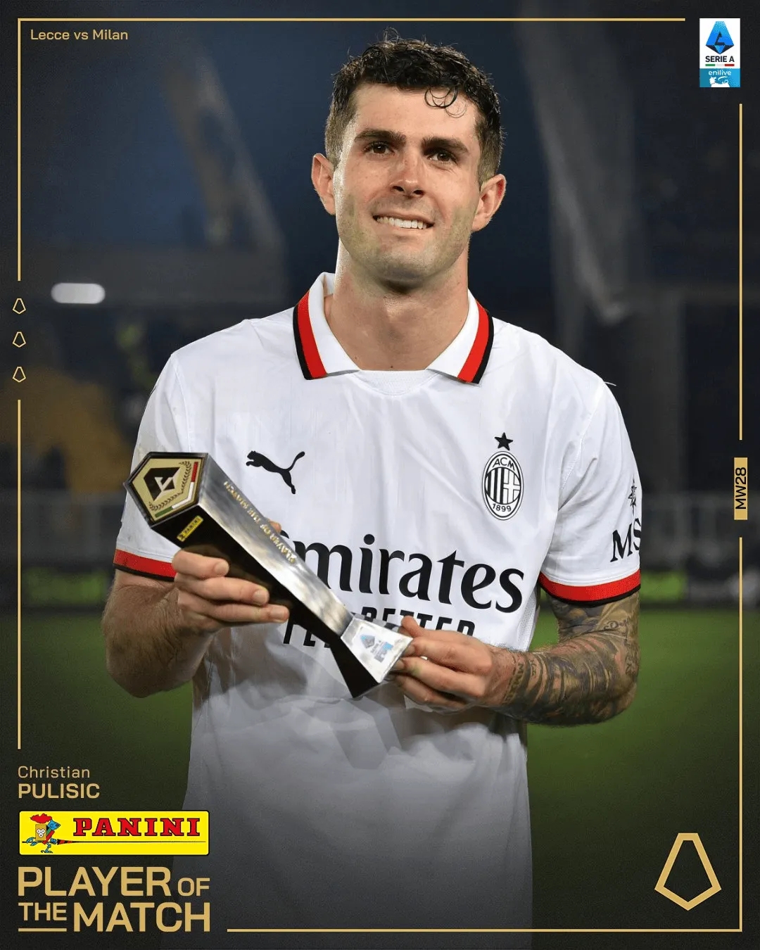 美國(guó)隊(duì)長(zhǎng)!官方:普利西奇當(dāng)選AC米蘭vs萊切全場(chǎng)最佳球員