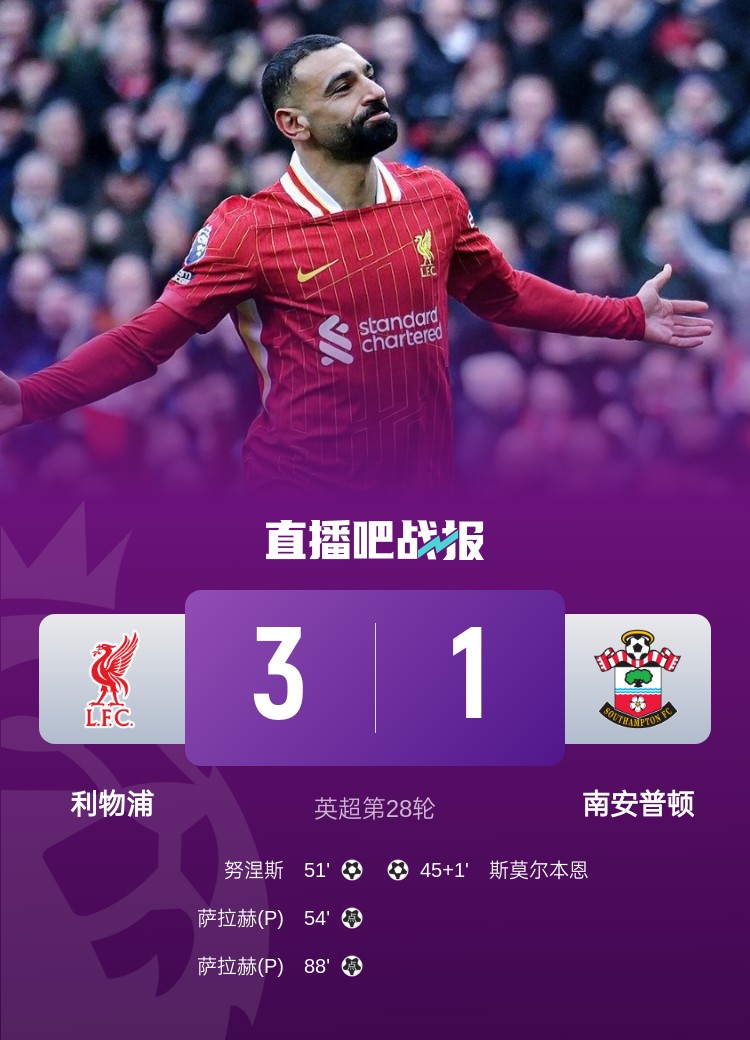 英超第28輪,利物浦3-1逆轉(zhuǎn)南安普頓。上半場,利物浦防線出現(xiàn)失誤,斯莫爾伯恩破門;下半場,努涅斯破門+造點,薩拉赫點射,菅原由勢手球送點,薩拉赫點射再中。