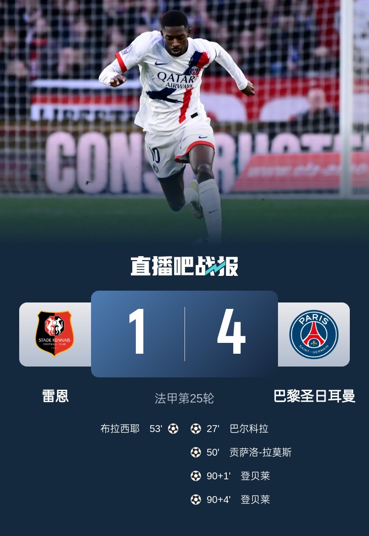 法甲第25輪,巴黎4-1大勝雷恩。上半場,巴爾科拉破門,隨后故意手球未吃牌,半場補時假摔最終領(lǐng)到黃牌;下半場,巴爾科拉助攻G-拉莫斯破門,布拉西耶扳回一球,登貝萊替補登場補時雙響。