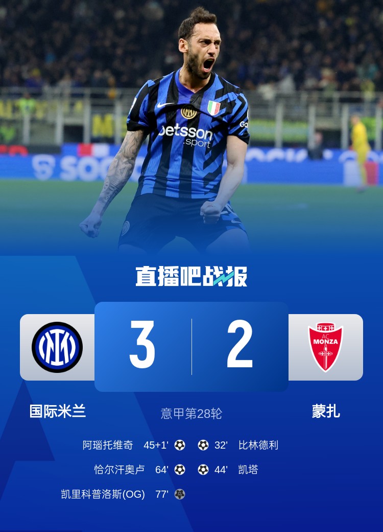意甲第28輪,國米3-2逆轉(zhuǎn)蒙扎。上半場,勞塔羅破門被吹無效,圖拉精彩撲救,比林德利首開記錄,凱塔遠射世界波,阿瑙托維奇扳回一城;下半場,恰爾漢奧盧凌空抽射扳平,勞塔羅頭球造烏龍,小圖拉姆推射中柱。