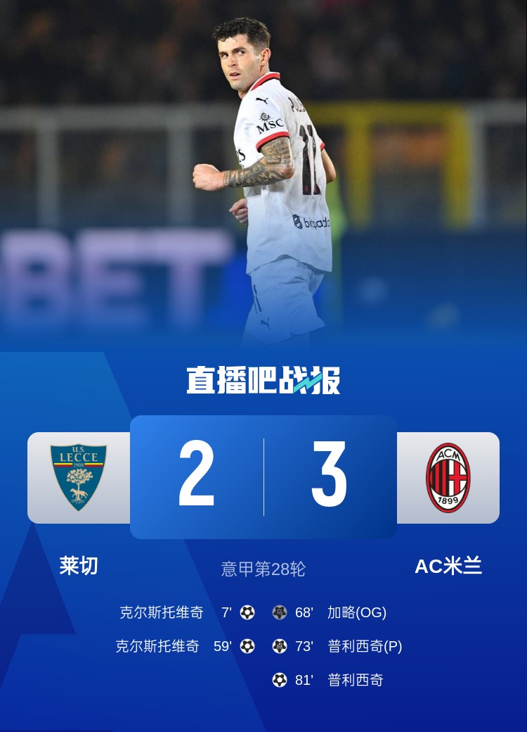 意甲第28輪,AC米蘭3-2逆轉(zhuǎn)萊切。上半場,圣地亞哥-希門尼斯和加比亞進球被吹,克爾斯托維奇世界波;下半場,克爾斯托維奇再下一城,菲利克斯造成加略烏龍球,普利西奇造點+點射,隨后又接到萊奧助攻打進制勝球。