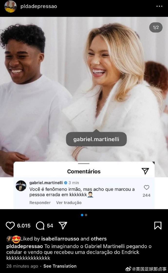 恩德里克在社媒曬自己與妻子Gabriely Miiranda的合影,但是卻把妻子標(biāo)注成了阿森納球員加布里埃爾-馬丁內(nèi)利。
