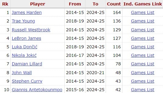 哈登過去10年里165場比賽至少25分10助 同期所有球員中最多